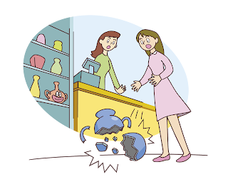 レジ前で花瓶を落として割ってしまう女性のイラスト
